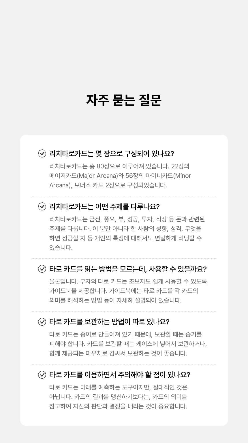 - 타로를 도박이나 확률 게임과 같은 곳에 사용하시거나 100% 미래를 예측하지 못한다는 이유로 환불하시는 것은 불가능합니다. 신중하게 생각하시고 구매해주세요.